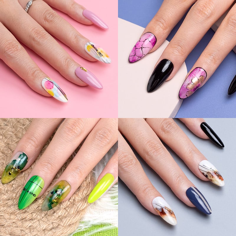 5) Χρησιμοποιείτε το Blooming χρώμα της επιλογής σας, διαμορφώνοντάς το σχέδιο που επιθυμείτε, αποφεύγοντας την επαφή με το δέρμα. Αφήνετε να στεγνώσει χωρίς να πολυμερίσετε.