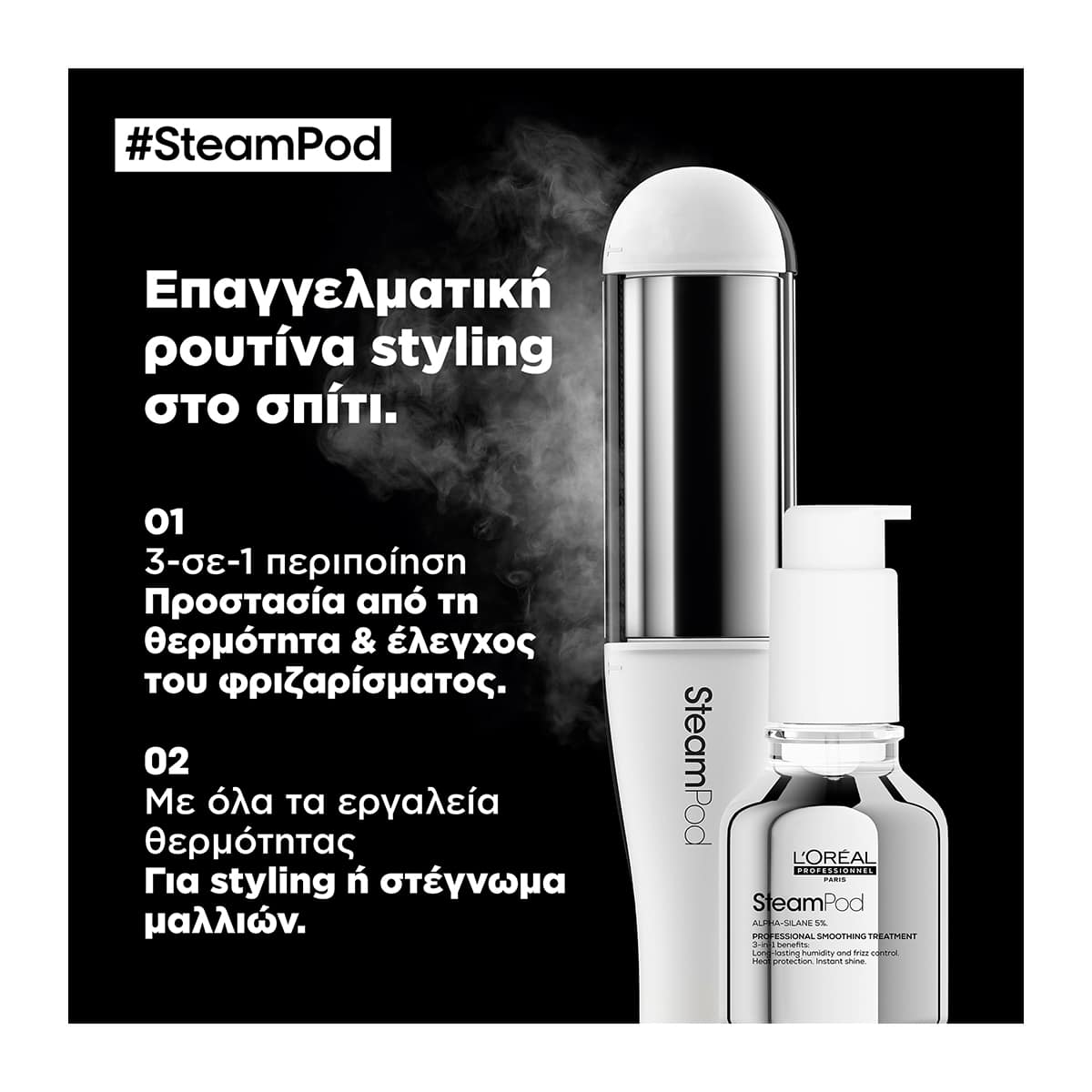 Η επαγγελματική SteamPod Περιποίηση Λείανσης είναι σχεδιασμένη χωρίς νερό και εμπλουτισμένη με άλφα-σιλάνη, ένα ενεργό συστατικό περιποίησης που προστατεύει από τη θερμότητα και τις συνθήκες υγρασίας.